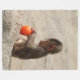 Un adorable bébé babouin assis dans le sable avec une orange sur cette superbe couverture en toison.