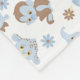 Cette couverture en toison présente un mignon motif de bébés animaux de la jungle, dont un lion, un singe, un éléphant, un ours à panda et un hippopotame. Les couleurs dominantes dans la motif sont le marron tendre et le bleu bébé. En haut se trouve une bordure en pois brun et blanc avec une bannière en cercle bleu clair assortie qui tient le nom de votre enfant en brun.