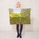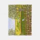 Une couverture en toison avec une belle image d'une scène naturelle : Un oiseau assis sur une clôture patinée, des fleurs sauvages poussant autour de la clôture, un fermier sur un tracteur, travaillant sa terre, des arbres avec des feuilles, et des terres agricoles de différentes couleurs. Oeuvre originale de W.B.