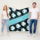 Cette jolie couverture en toison à thème football pour les filles présente l'image réaliste d'une balle de football qui a des panneaux bleu et blanc turquoise modelés à un angle avec la police sportive phrase de texte "I LOVE SOCCER" en turquoise qui s'étend entre les rangées inclinées des boules de football - personnalisez son nom dans une police manuscrite sophistiquée sur une bande de couleur blanche bouchée tout aussi angée - arrière - plan noir - par katz_d_zynes