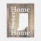 Planches en bois de grange légère élégante et chaude avec les mots "maison douce à la maison" dans le blanc à côté d'une silhouette blanche de l'Indiana !