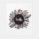 L'illustration est faite d'aquarelles et de gouache sur papier. Indigo, ocre et orange feuillage et fleurs avec un bonjour doré écrit à la main au milieu.