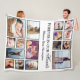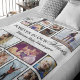 Une couverture en toison commémorative personnalisée avec un simple arrière - plan blanc qui peut être changée en n'importe quelle couleur, un collage photo de 16, le dicton "pour toujours dans nos coeurs", et leur nom.
