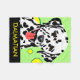 L'art coloré de chien comportant le Dalmate blanc avec les taches noires contre des cercles d'un arrière - plan vert clair et de jaune, nom de race a imprimé sur l'arrière - plan noir