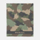 Parfait pour les soldats dans l'armée ou toute personne qui aime camouflage cette couverture en toison d'imprimé camo bois vous gardera douillette et chaude les nuits fraîches. De l'autre côté du bas, sur une bande noire, se trouve votre nom dans la typographie du pochoir bronzé pour que vous le personnalisiez. Conçu par l'artiste ©Susan Coffey.