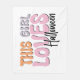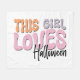 Ce design ludique et coloré comprend l'expression "This Girl Loves Halloween" en lettres audacieuses et rétro. Le texte est divisé en trois lignes, chaque ligne ayant une palette de couleurs distincte. Le mot "This" est dans une orange douce texturée, "GIRL" dans un violet pastel, et "LOVES" dans un rose bubblegum clair. Le mot "Halloween" est écrit dans un cursif noir et lisse, ajoutant du contraste et de l'équilibre au design. Chaque lettre a une forme légèrement arrondie, mousseuse, donnant à la conception une sensation amusante et fantaisiste, parfait pour célébrer l'esprit festif et léger d'Halloween.