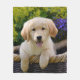Un mignon jeune chien aux yeux de chiot Golden Retriever dans un panier en osier au milieu des fleurs dans un jardin. Cette couverture est une idée cadeau enchanteresse pour les amateurs de chiens et d'animaux de compagnie. Un joli portrait de chiot Goldie photo prise par Katho Menden.