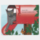 Chat gris qui se cachait dans une boîte aux lettres rouge attendant le facteur.