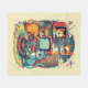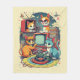Couverture d'une illustration fantaisiste montrant quatre chats joueuses profitant d'appareils rétro. Un chat est assis à côté d'une télévision vintage, tandis qu'un autre, portant des lunettes rouges, est perché sur des piles de livres et de disques. Un lecteur de cassettes et table tournante évoque une esthétique du milieu du siècle.