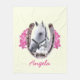 Cheval blanc peint sur un arrière - plan crème encadré par un fer à cheval et des rhododendrons roses. Votre nom en rose juste en dessous du portrait de cheval. Il y a aussi une dispersion des étincelles au fond du fer à cheval.