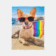 Cette jolie photo montre un chihuahua chien sur la plage portant un drapeau Gay pride couleur arc-en-ciel.