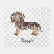 Illustration originale de Destei d'un mignon chocolat à cheveux courts brun et tan dapple couleur robe chien de race Dachshund. L'arrière - plan a un motif d'empreintes de pattes de chien gris. Il y a aussi une zone de texte personnalisable pour un nom.