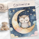 Cette chouette est heureuse de s'endormir sur cette confortable couverture. Imaginé sur une lune en croissant, le hibou endormi est entouré de nuages pastel et d'étoiles dans le ciel bleu nuit foncé. Personnalisez avec un nom pour la touche finale.