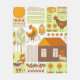 Coq et deux poules, oeufs, fleurs, maison, tirant sur un arrière - plan blanc. Motif géométrique, abstrait, dessiné à la main, vintage