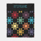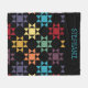 Ajoutez un nom pour créer un cadeau personnalisé qui les gardera chauds et grillades. Cette couverture jetée en toison est conçue pour ressembler à une courtepointe Amish avec un bloc de courtepointe Ohio Star imprimé en rouge, violet, bleu, jaune, or, orange et vert contre un arrière - plan noir. Il est prêt à être customisé avec un nom ou un autre texte en haut en lettres bleues.