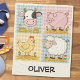 Cette couverture ludique comprend un quatuor d'animaux de ferme classiques—une vache, un cochon, un poulet et un mouton—tous dressés contre un arrière - plan en vichy coloré et texturé.