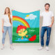 Célébrez la pluie avec cette jolie couverture en polaire de canard heureux. La couverture a un joyeux canard jaune éclaboussant dans une flaque. Le canard porte un casquette à pois et a un parapluie rouge. Dans le ciel, il y a un bel arc-en-ciel coloré, le soleil, les nuages et la pluie. Personnalisez la couverture avec le prénom de votre enfant.