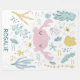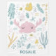 Belle illustration d'un crabe entouré de coquillages, de flore, d'étoiles de mer, et plus, dans une jolie palette de couleurs pastel, personnalisée avec votre nom.