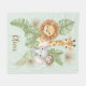 This charming, personalized blanket features four cute, friendly baby safari animals—a giraffe, a lion cub, a baby elephant, and a monkey—peeking out from a lush backdrop of soft green tropical jungle leaves and dried palm fronds. This gender-neutral, soft-toned art is ideal for jungle nursery decor orbaby shower gifts.