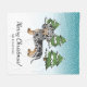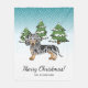 Illustration originale de Destei d'un mignon poil court noir et tan dapple couleur robe chien de race Dachshund. Le chien est placé dans une scène hivernale avec trois sapins verts et la chute de neige. L'arrière - plan est un dégradé bleu à blanc qui donne un aspect froid d'hiver. Il y a aussi une zone de texte personnalisable qui se lit maintenant "Joyeux Noël !" dans une belle police de script. Il y a une autre zone de texte personnalisable pour un nom de famille ou un autre texte personnalisé.