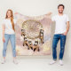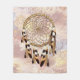 Un design d'attrape-rêves avec des garnitures dorées et marron qui comprend un cercle de bambou rond, une toile de vie avec des plumes de tons marron et des perles rouges sur un fond de plumes douces.