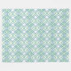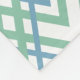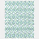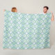 Cette grande couverture en toison a un design art déco de diamants se chevauchant en verditer (vert) et bleu sur un champ de blanc.