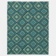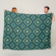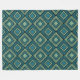 Cette grande couverture en toison a un design art déco de formes en losange avec des lignes diagonales et des diamants colorés dans deux tons turquoises.