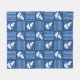 Une couverture en toison à thème hivernal avec un motif de courtepointe de deux tourterelles, des flocons de neige et des rayures verticales et horizontales, en bleu clair, bleu foncé et blanc.