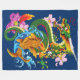 Un dragon chinois vert avec un koi orange avec fleurs de lotus et fleurs de cerisiers sur fond de bleu foncé.