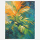 Cette œuvre d'art abstrait expressive capture l'esprit vibrant des palmiers tropicaux à travers des coups de pinceau audacieux et fragmentés ainsi que des contrastes de couleurs dynamiques. Des couches de vert luxuriant et de sarcelle profonde forment un arrière-plan riche et texturé, tandis que des éclats de jaune doré et d'orange chaud rayonnent à travers les feuilles de palmier, créant une sensation de lumière du soleil perçant à travers le feuillage dense. La composition semble vivante et énergique, comme si le palmier se balançait dans une brise côtière chaude.