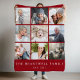 Cette couverture en toison keepsaké présente un collage de neuf de vos photos de famille de carrés préférées sur un arrière - plan rouge canneberge Ajoutez le nom de votre famille et la date d'établissement ou un autre texte en bas en police serif blanche.