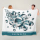 La couverture en toison à thème de basketball de cette fille cool présente une "explosion" de boules de basket turquoises et blanches de tailles différentes et des formes d'étoiles grises et turquoises - l'étoile turquoise a un minuscule motif de pois blancs - personnaliser avec le nom du joueur et le numéro de maillot - la bande de couleur turquoise au bord inférieur est personnalisable - katz_d_zynes