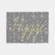 Texte Whimsical "Hygge" en jaune pâle avec arrière - plan de fleurs blanches, bleues et violettes pâles sur arrière - plan gris.