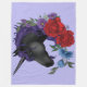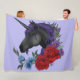 Une licorne noire aux fleurs rouges, violettes et bleues sur fond de violet clair