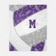 Cette couverture en polaire à thème de volleyball boho pour elle présente l'image réaliste d'un volleyball abstraitement surdimensionné qui a des panneaux violets, gris et blancs - un doodle continu motif de paislies, fleurs et plumes en blanc couvre les panneaux violets et gris du volleyball - personnalisez avec le nom et monogramme de l'athlète, lettre de varsité ou numéro de maillot - par katkatkatkatka z_d_zynes