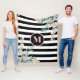 cette couverture en toison débute par un arrière - plan rayé noir et blanc propre et alternatif. Deux coins fleurissent avec des bouquets de fleurs rose vif d'aquarelle, avec des sprigs d'eucalyptus, des branches d'oliviers et d'autres éléments botaniques verts. au centre se trouve une lettre monogramme personnalisable rose vif, assise dans un cercle noir avec une étroite bordure blanche, entourée d'un léger gradient de quartz rose rose légèrement plus épais.