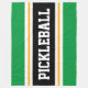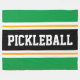 Cette conception sportive et sportive présente du texte PICKLEBALL en gras à l'intérieur d'une large bande noire surlignée avec deux bandes de course blanches et jaunes contre des bandes extérieures verdoyantes. Le texte de cette conception peut être personnalisé.