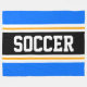 Cette conception sportive et sportive présente du texte en gras SOCCER à l'intérieur d'une large bande noire surlignée avec deux bandes de course blanches et jaunes contre des bandes extérieures bleu vif. Le texte peut être personnalisé.