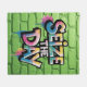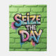A graffiti-style text design reading "SEIZE THE DAY" on a lime green brick wall background. The text is rendered in a bold, three-dimensional graffiti font style with black outlines and shadowing. Each letter is filled with a gradient of colors including blue, pink, yellow, and turquoise, creating a rainbow effect. The text has a 3D effect with shadows and depth, giving it a raised appearance against the wall. The letters are painted with spray paint effects, showing drips and splatters around the edges. The brick wall texture is clearly visible with horizontal lines running across the background. The overall composition has a street art aesthetic with the vibrant colors bleeding and dripping at the edges of the text.