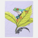 Une mignonne grenouille à arbre rouge est assise sur trois feuilles sur un fond de violet clair