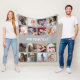 Un cadeau photo personnalisé couverture flecy avec un arrière - plan gris qui peut être changé en n'importe quelle couleur, 16 photos de votre choix, et un modèle texte simple.