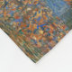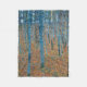 Il s'agit d'oeuvres de Gustav Klimt, Beech Grove 1, 1902. Les oeuvres d'art dépeignent une forêt dense de grands bouleaux, minces, aux troncs pâles marqués par des lignes verticales foncées. Le feuillage est dépeint dans les tons bleu, vert et jaune, ajoutant un sens de profondeur et de vibrations à la scène. Le sol de la forêt est recouvert d'une couche de feuilles orange et marron, créant un contraste saisissant avec les tronçons d'arbres plus légers. La composition globale utilise des techniques pointillistes et impressionnistes, donnant à l'image une apparence vivante et texturée. La verticalité des arbres souligne la structure sereine et rythmique de la forêt.