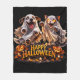 Snuggle up with the most adorable spirits of the season this ghostly best friends fleece blanket features a joyful dog and a curious kitten dressed in their flowing white ghost sheets with glowing eyes that light up the night set against a rich black background with flickering jack-o'-lanterns and a rustic happy Halloween banner this high detailed throw adds a touch of spooky, cute magic to any home perfect for chilli autumn nights movie marathons or as a festive gift for pet lovers