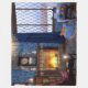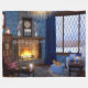 Un coin lecture douillet pendant une journée d'hiver enneigée, avec un chat gingembre assis devant le feu flamboyant. Autour du foyer, des fauteuils moelleux, des bougies et des piles de livres, une tasse à vapeur complètent le confort. À l'extérieur d'un saule couvert de gel et d'une haie de hêtre sont masqués par la chute de neige.