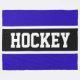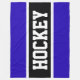 Cette conception sportive présente un texte HOCKEY athlétique audacieux à l'intérieur d'une large bande noire centre surmontée de rayures blanches contre rayures royales bleues.