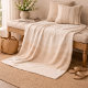 Beach inspired neutral textile in ivory with overlapping blush beige wave forms and fine taupe edging. The layered shoreline pattern adds soft dimension while keeping a light summer palette. Designed for draping over a linen sofa, folding at the foot of a bed, or styling a breezy coastal guest space.