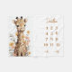 Adorable et élégant, cette couverture Baby Milestone est la façon parfaite de suivre la croissance de votre bébé chaque semaine et mois. Utilisez un bateau animal jouet ou un animal sauvage à côté du numéro et de la semaine ou du mois où votre bébé est. Comprend une jolie girafe à l'aquarelle peinte à la main avec un feuillage rose, jaune, gris et vert. La typographie brune "Johnathan" peut être changée pour correspondre au nom de votre bébé.