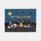 Un groupe de chats et de chiens font des tours ou des soins pendant la nuit d'Halloween ! Les animaux de compagnie dans ce design comprennent un chiot Akita Inu habillé en cowboy, un chat norvégien en en forêt avec couronne de princesse, un Husky sibérien tirant un chariot avec un citrouille dedans, un chat persan habillé en ange, un papillon, un basset hound, un basenji, un Poméranien habillé en sorcière, et un collier frontalier habillé en chien de police .. Pendant ce temps, chauves-souris et sorcières volent au-dessus du quartier sous une pleine lune ! Ce design peut être customisé ou personnalisé en ajoutant votre propre texte ou vos propres images !