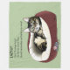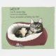Un chat tabby posé dans son lit de chat bordeaux défendant sa paresse.