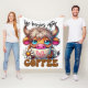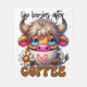 A playful and vibrant design showcases an adorable highland cow sipping coffee from a mug adorned with two hearts. A cheerful daisy adds charm to the scene, accompanied by colorful text that reads, "Life begins after coffee." This delightful design is featured on a variety of products, making it a perfect gift for coffee enthusiasts.